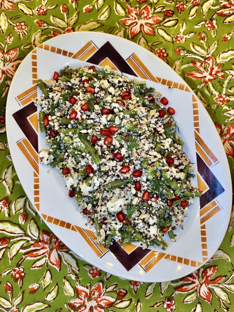 - Dans un grand saladier, regroupez le boulgour + les haricots verts + les graines de grenade + la feta émiettée.